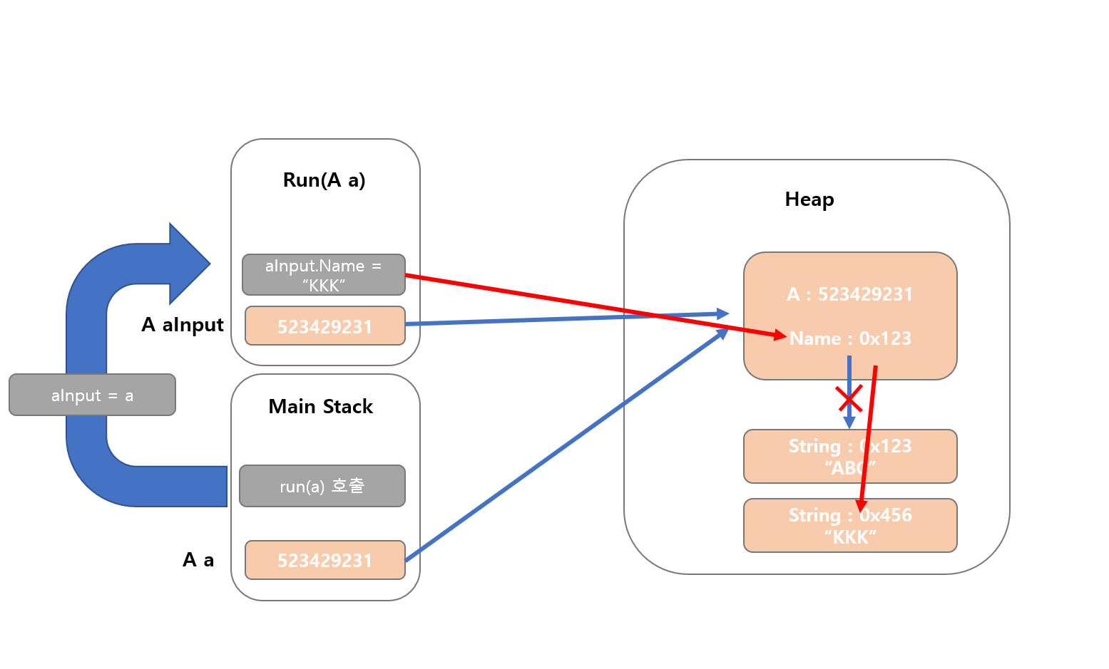 위의 코드에서 run() 메소드는 AA aa 의 주소값을 inputAA 라는 파라미터로 받아온 다음 그 파라미터의 값에 그냥 새로운 myAa 라는 객체의 주소값을 할당해보고 메소드를 종료하는 것 뿐이다.