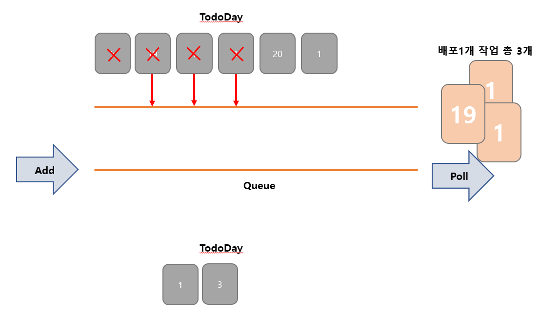 똑같이 20일이 걸리는 5번째 작업을 큐에 넣고 이것보다 오래 걸리는 작업이 나올때까지 모든 작업을 큐에 넣어줘 하나의 배포로 만들면 된다.
