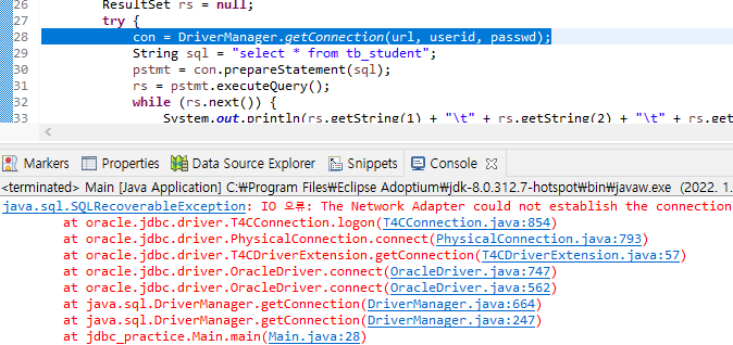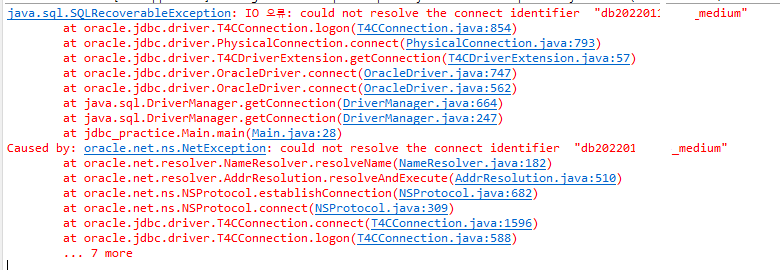 잘못된 연결 식별자라는 다른 예외를 보여주는 것을 통해