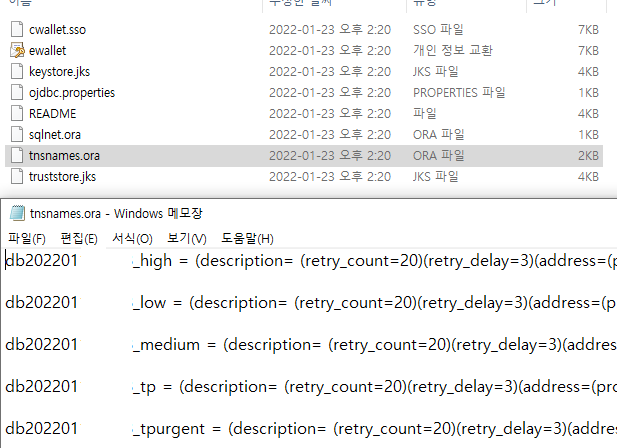 지갑을 까보면 다음과 같이 구성되어있는데 tnsnames.ora 에 있는 tns 이름을 활용해 자바에서 연결할 것이다.