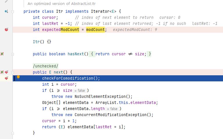 반복을 위해 맨 처음에 초기화 했던 Itr 클래스의 expectedModCount 에 대한 수치는 계속 그대로이기 때문에 예외가 발생하는 것이다.