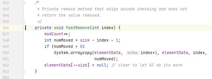ArrayList의 remove(Object o) 메소드를 확인해보면 결국 다음과 같은 fastRemove(int index) 라는 메소드를 수행하게 된다,