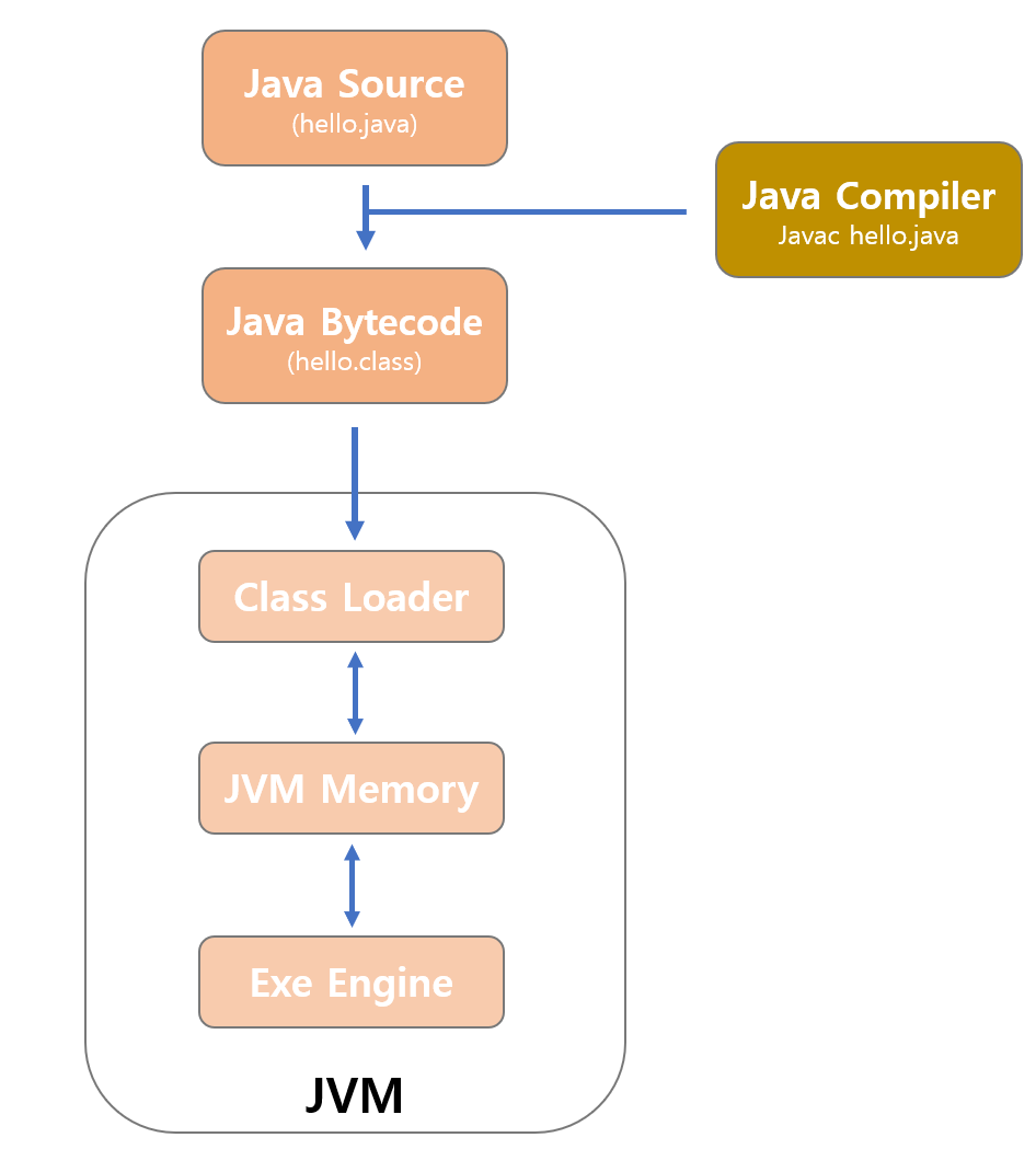 이 .class 바이트 코드는 운영체제에 맞는 자바 가상 머신(JVM)에서 먼저 해석되고 운영체제에 맞는 완벽한 실행 파일로 바뀐다.