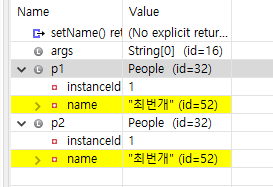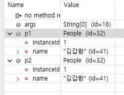 디버깅 해보면 People 클래스의 객체인 p1 과 p2 모두 32 라는 id 를 가지고 있음을 확인할 수 있다.