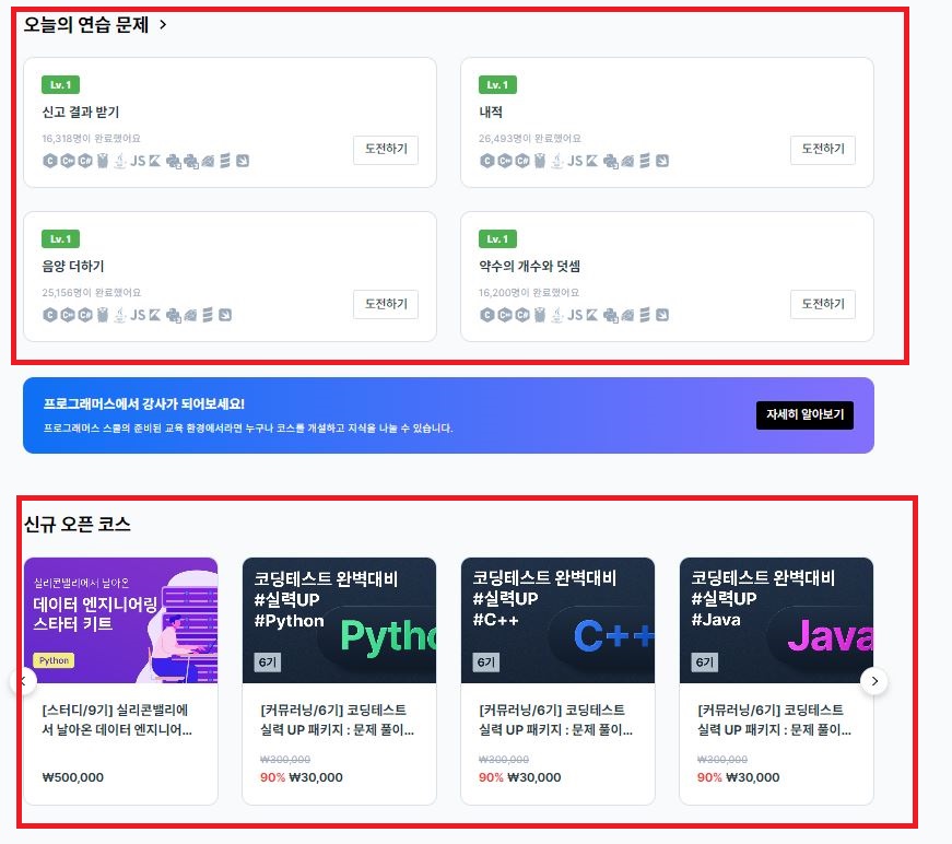 이 페이지 구성을 보면 오늘의 연습문제 목록4개가 있고 신규 오픈 코스 목록이 여러개 나타난다.