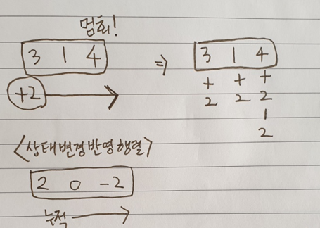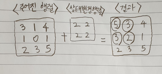 완전탐색이라면 루프를 돌아 상태변경 행렬을 크기만큼 반영하고 다 하면 루프를 돌아 주어진 행렬에 반영하는 형태로 갔을 것이다.