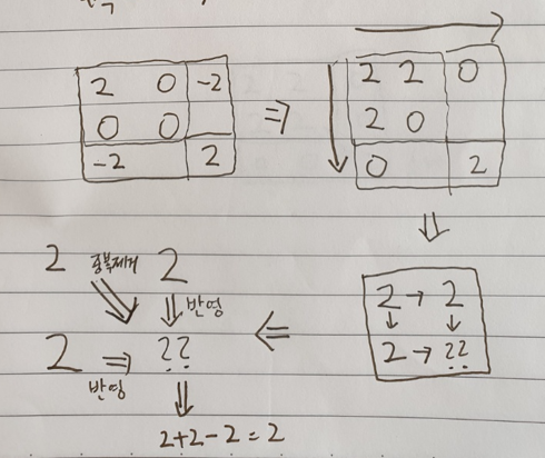 이대로 행과 열로 누적합을 적용한다면 우리가 관심을 가지고 있던 2 라는 업데이트 값이 각각 이전의 위치였던 앞 대각좌표로 부터 두번 반영된 것이니 그 값을 빼주는 형태로 업데이트 해주면 된다.