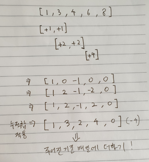 모두 같은 수치를 더하거나 빼는 형태이기 때문에 누적합을 응용할 수 있을 것이라고 생각하고 접근했다.